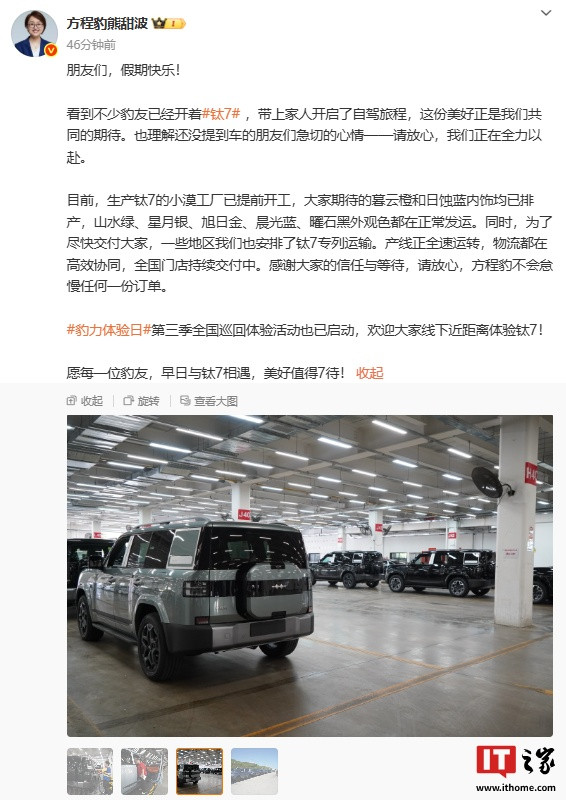 IT之家10月4日消息,比亚迪集团-方程豹事业部总经理熊甜波今日发文透露,生产钛7的小漠工厂已提前开工,暮云橙和日蚀蓝内饰均已排产,山水绿、星月银、旭日金、晨光蓝、曜石黑外观色都在正常发运。